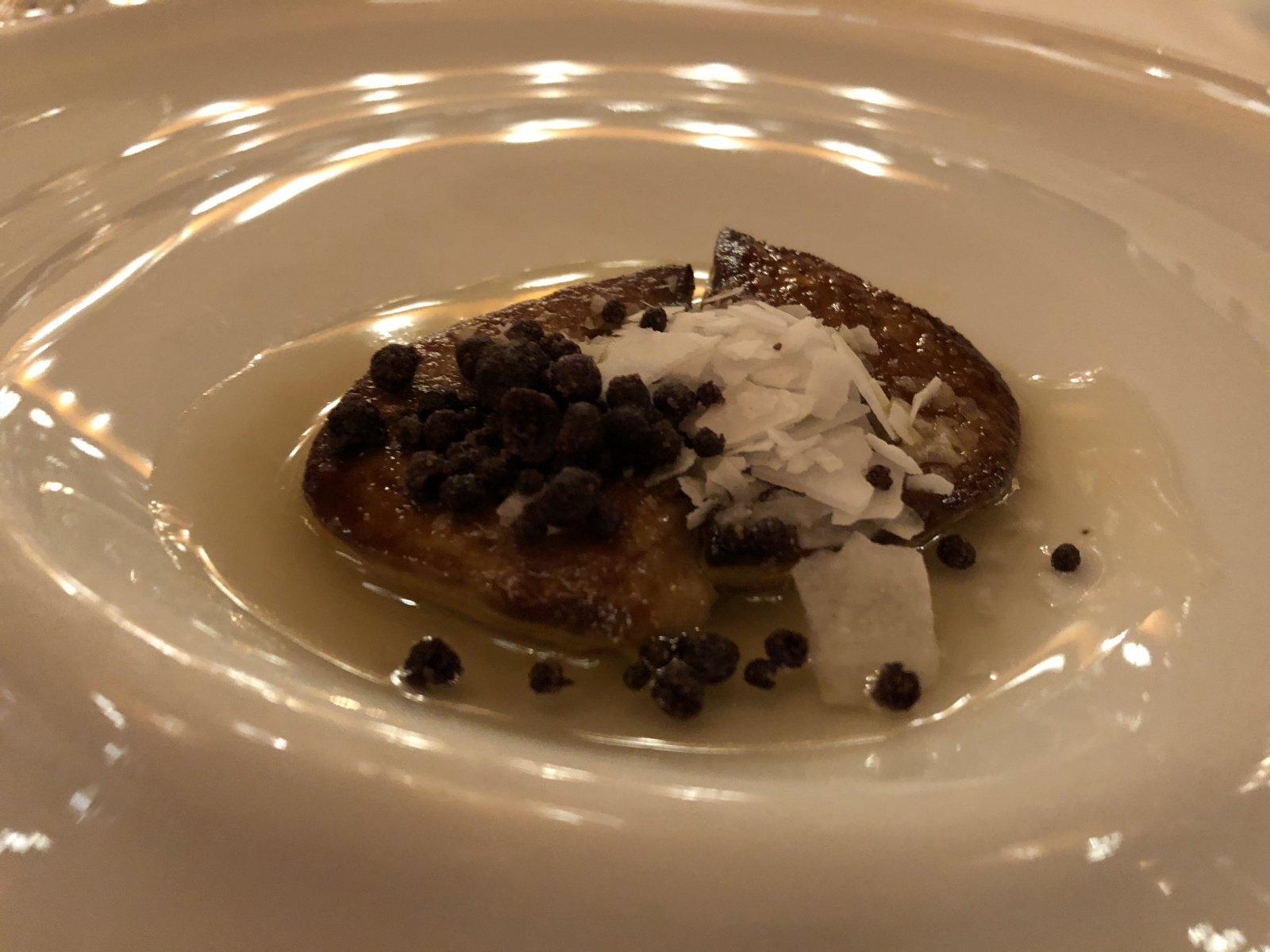 Nos encantaron los amuse bouche, las galletas tricolor, los snacks  y la manteca especialmente grabada con la imagen del Akelarre, aquel macho cabrío que preside las reuniones de brujas.   Mención aparte para unas galletas que parecían de chocolate talladas a mano.    El trampantojo en cuestión era una suerte de “canapé de morcilla” con la imagen de un chancho.  Muy buena idea y MUY RICA.  La vajilla es preciosa, sobria,  no hay grandes sorpresas en el menú pues el fuerte de  Pedro Subijana es el producto, las técnicas y los sabores.  No vas a ver volando globos con el postre, ni humo saliendo del plato,  ni piedras comestibles,  ni azúcar con formas, ni nada que te distraiga del menú.    No lo necesita,  tiene una trayectoria tan vasta y tan genial, que no precisa de ningún otro recurso.