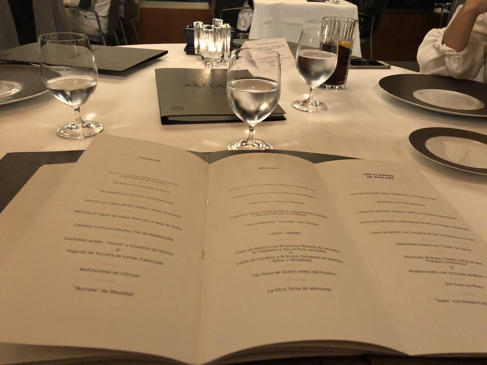 El restaurante Akelarre  no tiene menú a la carta.   Según nos contaron desde la primavera 2018  solo ofrece tres menús degustación: Aranori, Bekarki (ambos de ocho platos) y Los Clásicos de Akelarre (7 platos).  Lo interesante es que cada comensal puede elegir en su mesa el menú que le plazca, ellos se arreglarán para que cada quien tenga lo que le corresponde y a tempo.