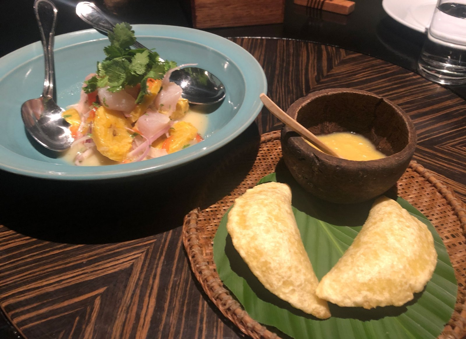 No nos jugamos mucho con la comanda debo decir, es que antes de ir a lo desconocido quise probar las versiones Schiaffinescas de lo ya conocido.  En fin!!! Paso a relatar:    Nos deleitamos con unas “causitas pitucas” de camarones tarapotinos escabechados, leche de coco, causa de pituca, maduros asados y mayonesa de tapioca.  Resulta que la pituca es un tubérculo de la selva peruana que queda muy bien en lugar de la típica papa.    Luego seguimos con  las empanadas de carne del monte que nos recomendaron especialmente y que venían en masa de yuca y rellenas de carne de caza (les debo el nombre del animal pues no pude retenerlo de ningún modo). Lo que si tanto la empanada como la salsa acompañante eran MUY RICAS.  Muy.